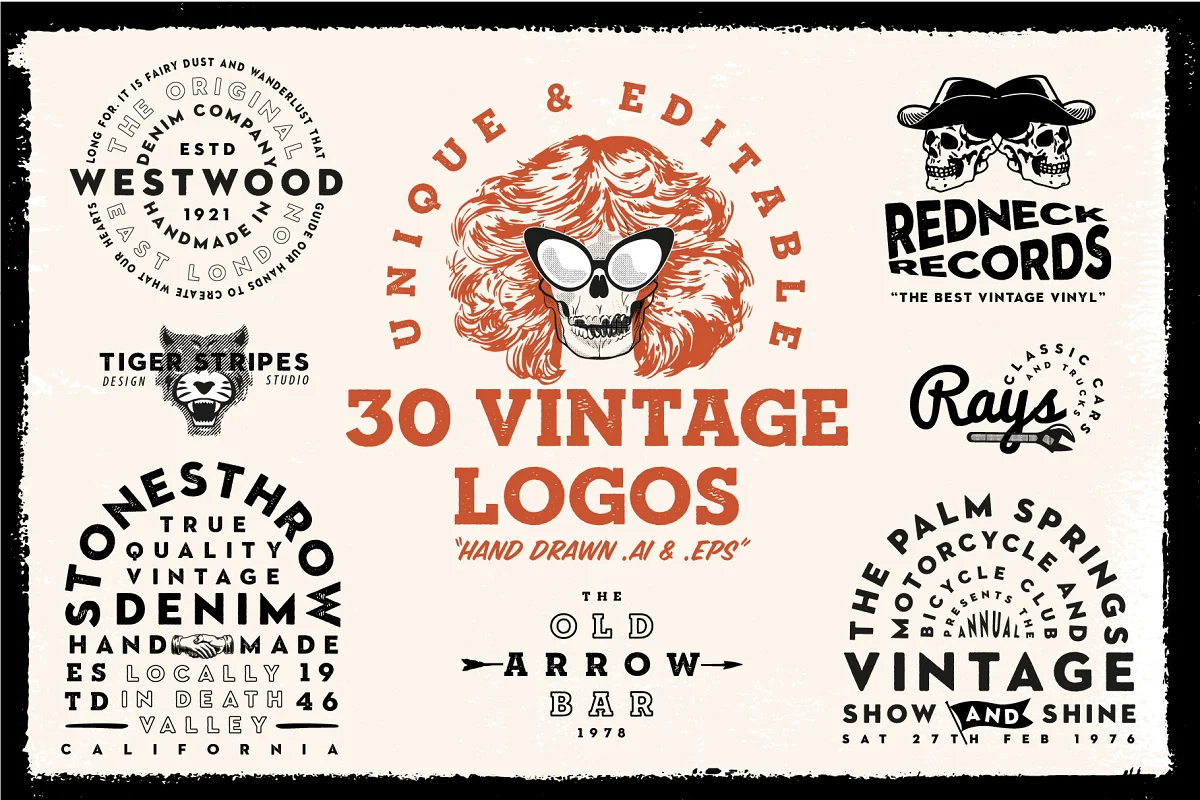 The perfect vintage logo design bundle including 30 logos, 35 icons, and 10 textures.